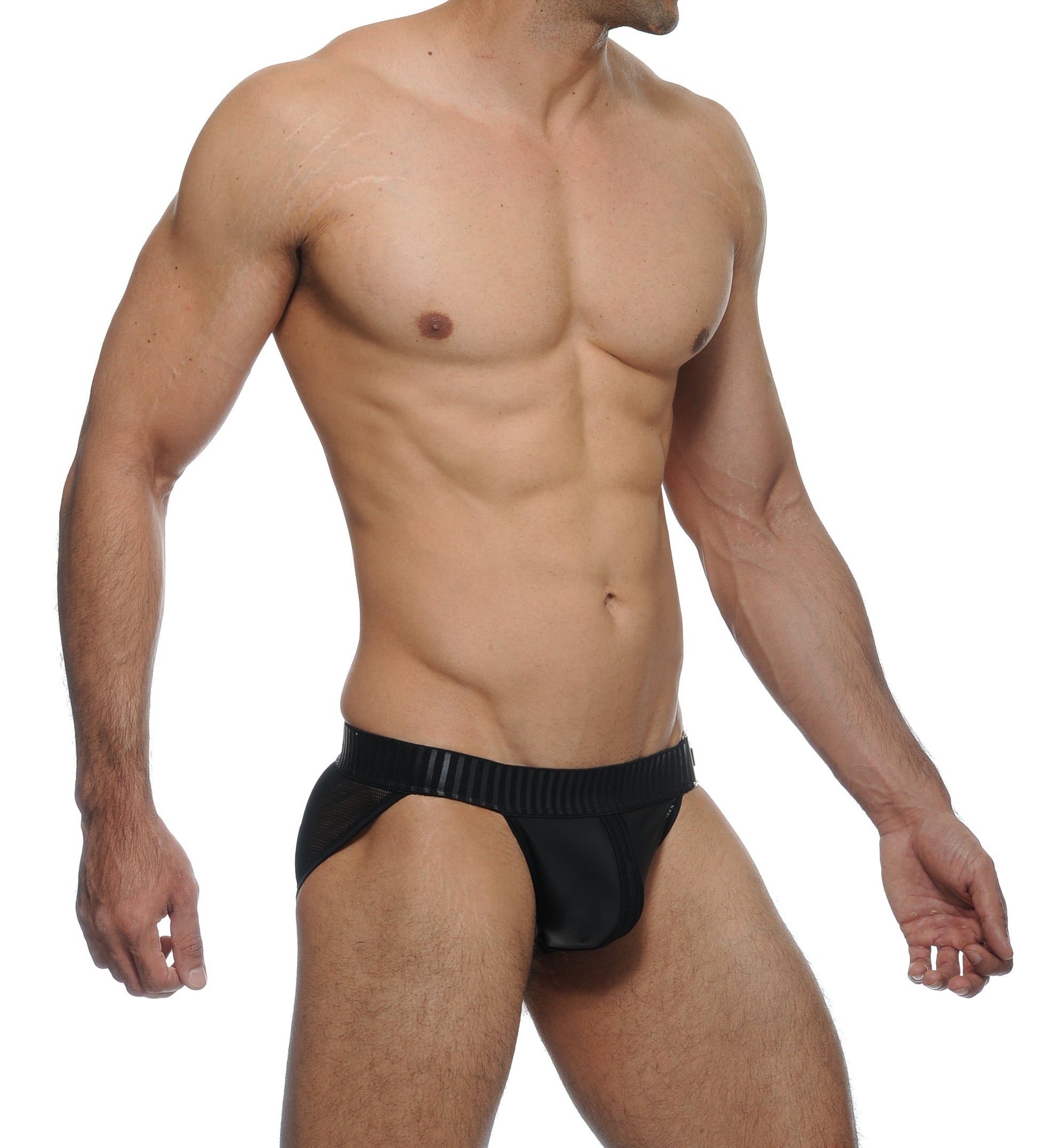 STUD's Corten brief is a sexy low rise tanga cut crafted from stretchable PVC and mesh fabric with a quality striated rubberized waistband that features a detachable stainless steel metal buckle. The front contoured pouch has a contrasting strip of black perforated mesh reinforced with tonal binding on either side to tease and reveal your bulge. The back sports an arched back contrasting mesh and PVC to accentuate the curve of your butt.